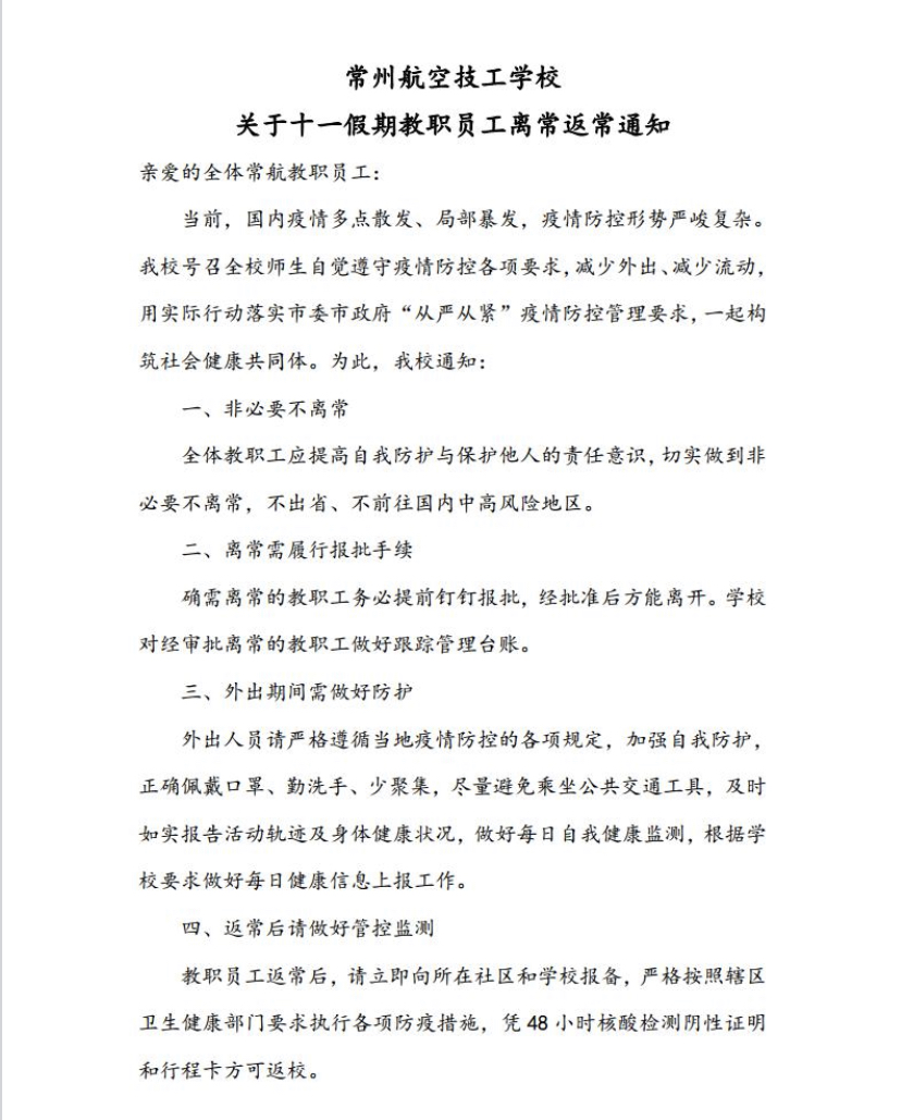 常州航空技工学校关于十一假期教职员工离常返常通知