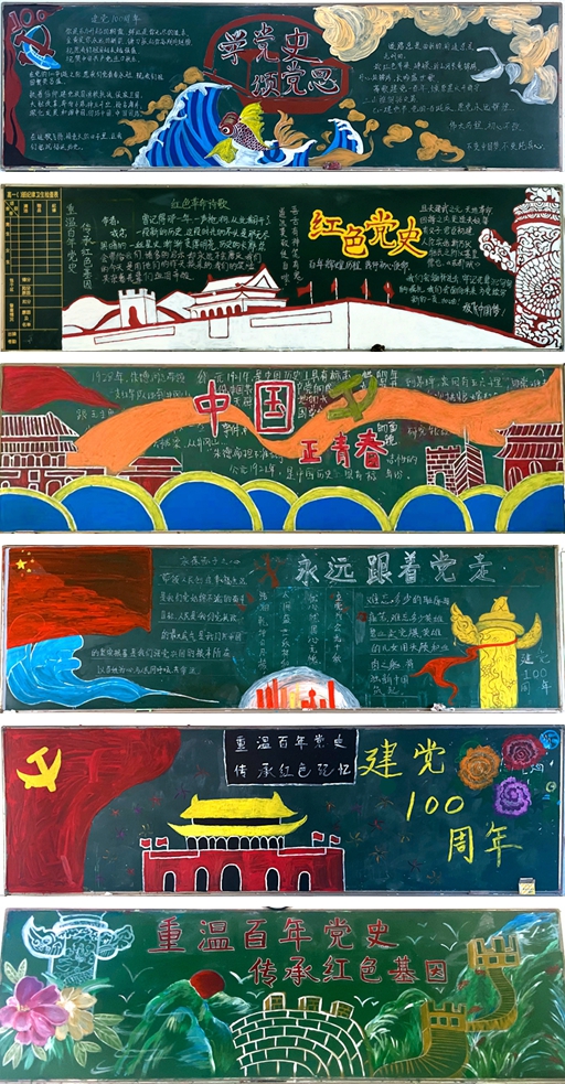 红色基因是一种革命精神的传承,红色,象征光明,象征信仰,凝聚力量,引领未来。红色基因是中国共产党人的精神内核。各班级学生以中国红为主色调,以党史为主题绘制了一期黑板报,营造出浓厚的党史学习氛围。
