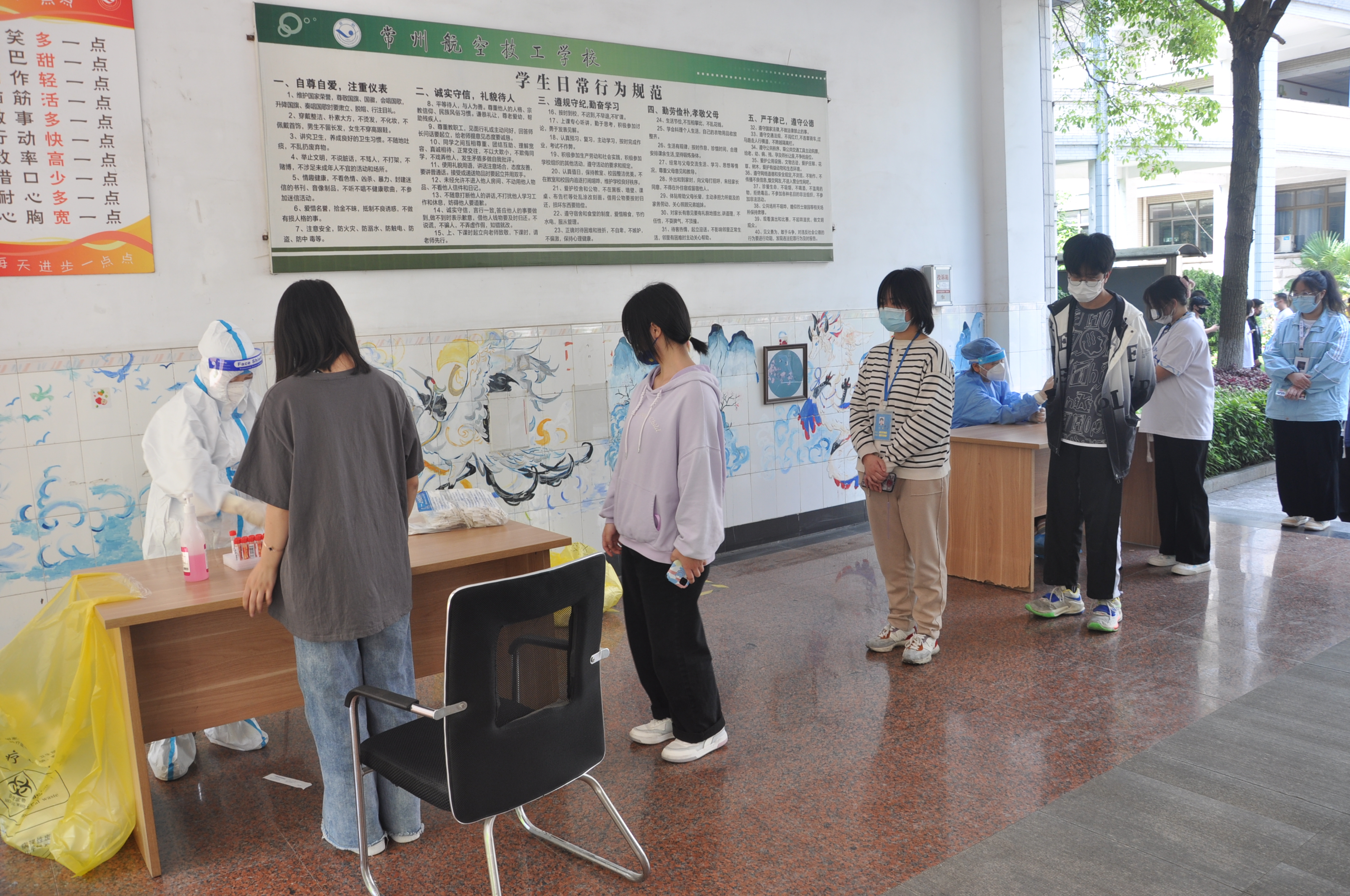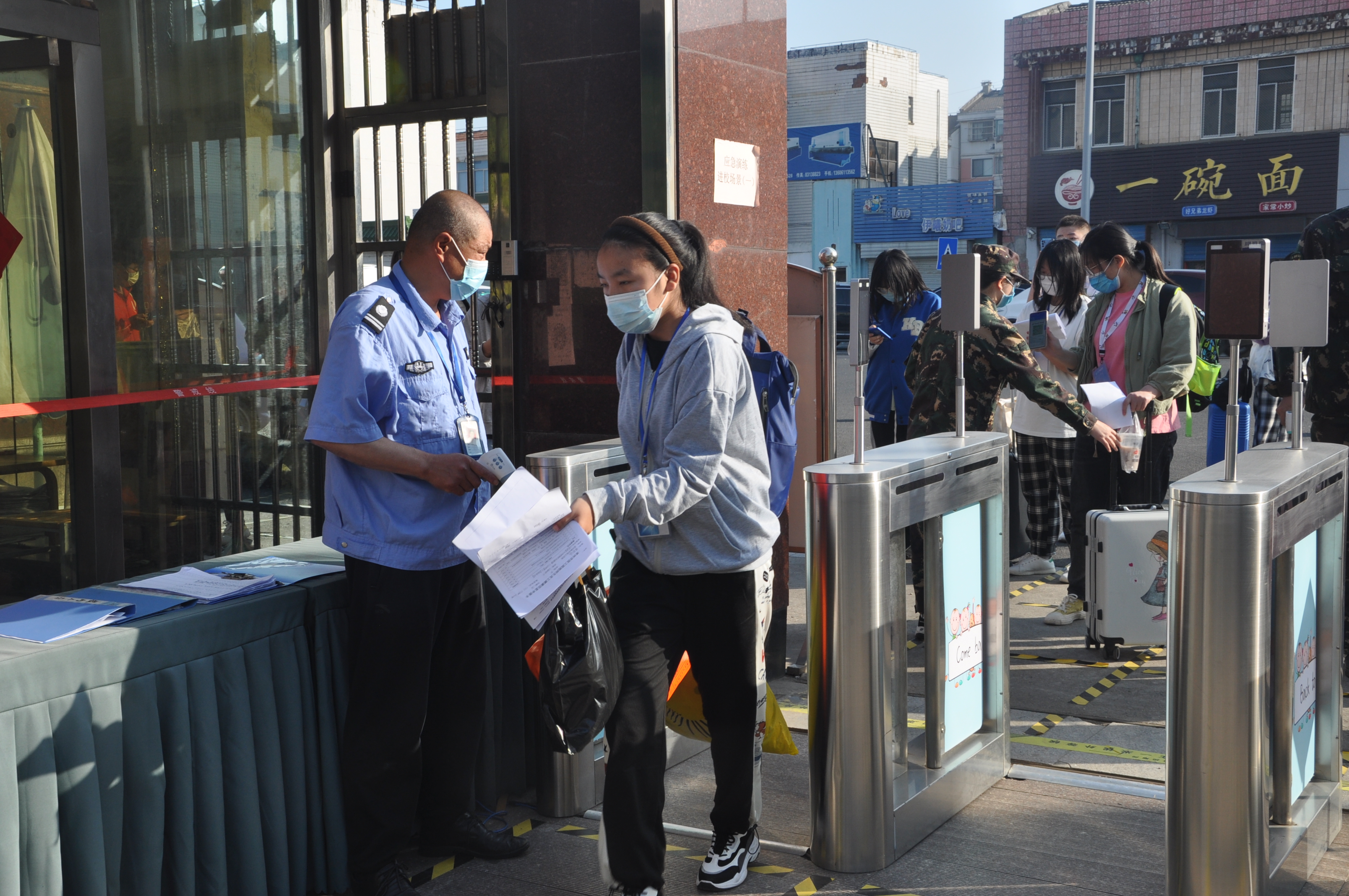 各班主任在树人楼一楼过道设置“材料审核、收集”区,学生向班主任递交“复学材料”,如不符合复学要求,学生原路返回,劝返回家,不得进入教学、生活区域。