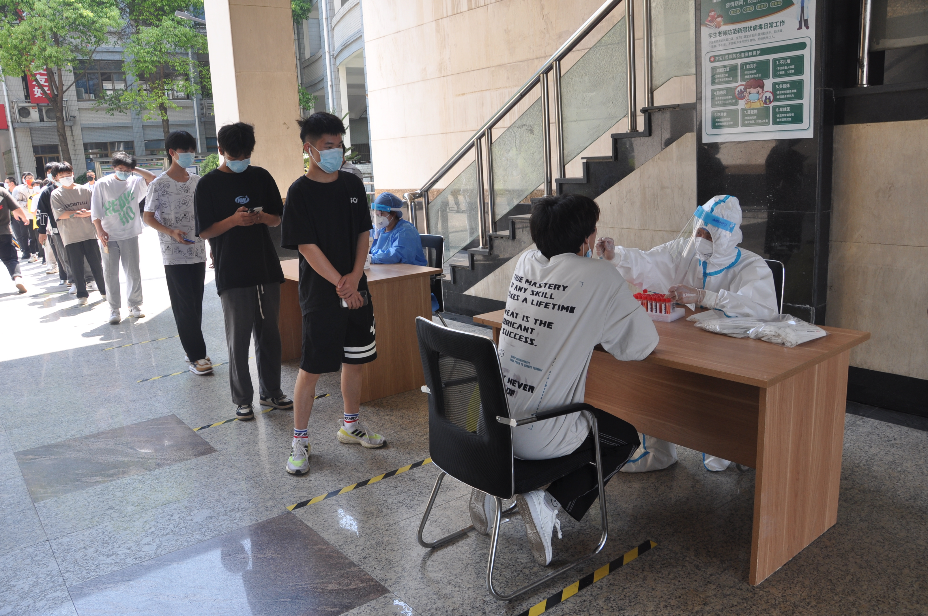 于当日中午12:30我校组织全校师生进行全员核酸检测,切实保障全体师生教职员工的身体健康和生命安全。