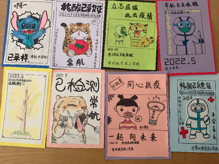 同学们积极参加本次活动,设计了不同风格、不同含义的核酸检测完成卡。5月11日当天,学校将此次核酸检测卡制作成实物凭证,分发给师生,让师生在核酸检测时的每一分等待变成期待!师生们在结束后纷纷拍照,有的还晒朋友圈,让每一次核酸检测充满成就感。