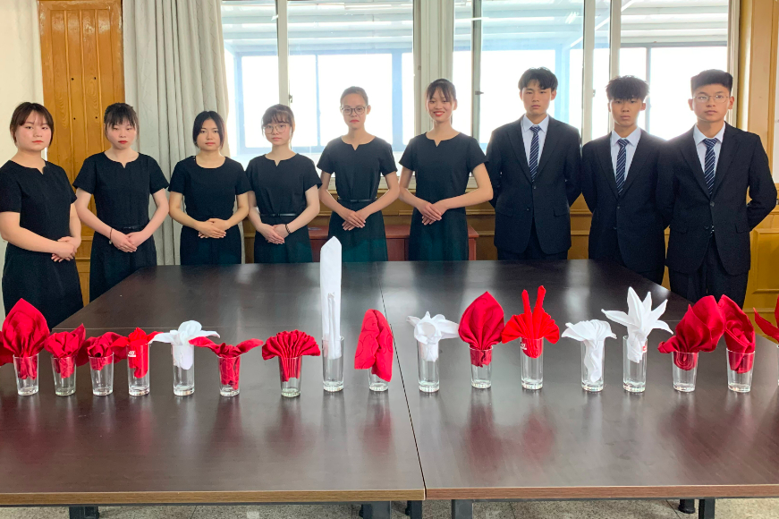 校内配有一流的导游模拟实训室、中西餐厅实训室、茶艺室、客房标准间及铺床实训室等,