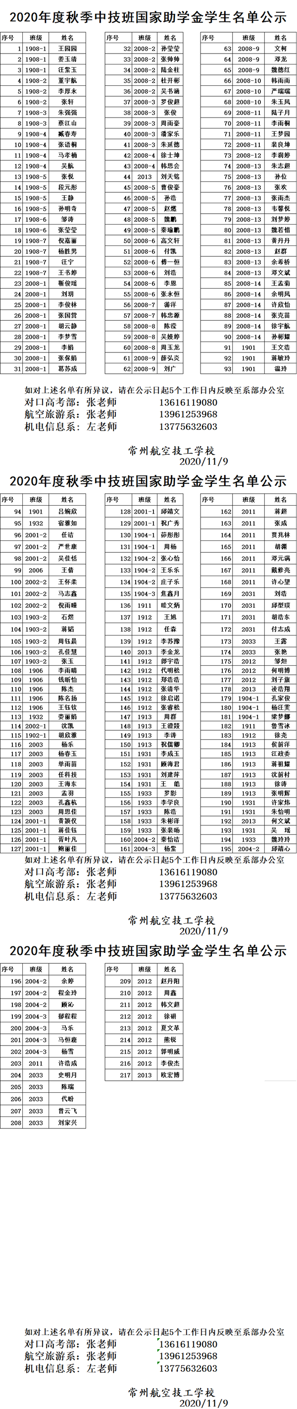 2020年度秋季中技班国家助学金学生名单公示
