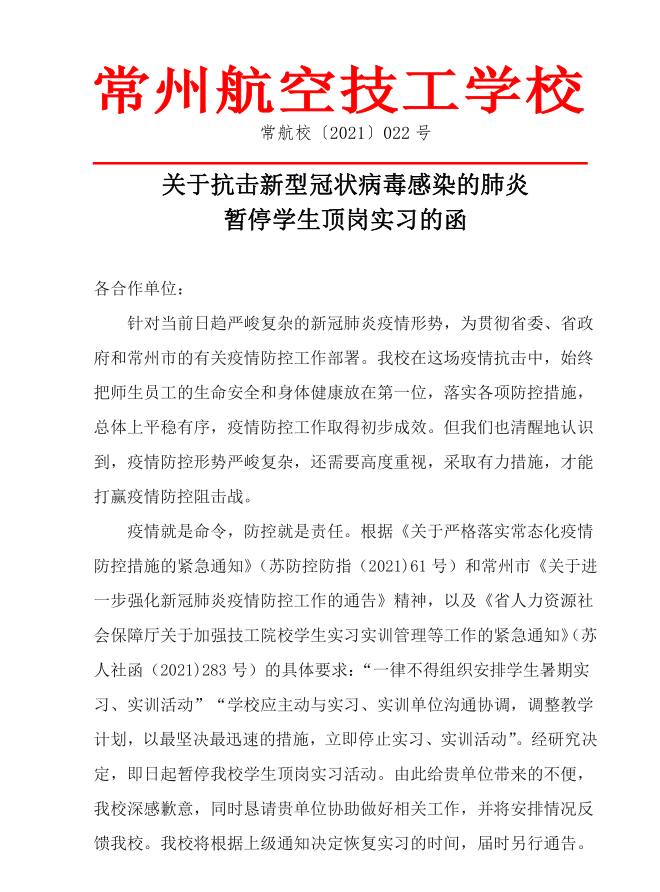 关于抗击新型冠状病毒感染的肺炎暂停学生顶岗实习的函