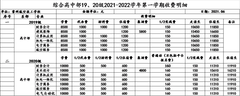 综合高中部19、20级2021-2022学年第一学期收费明细