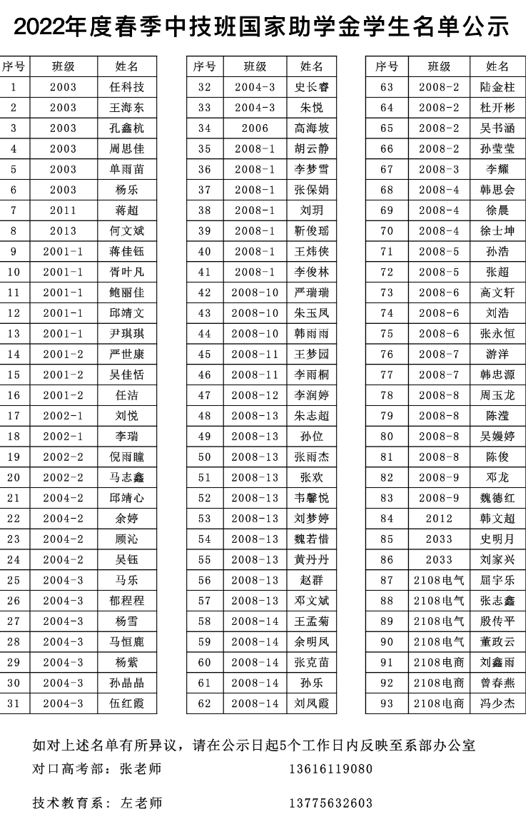 2022年度春季中技班国家助学金学生名单公示
