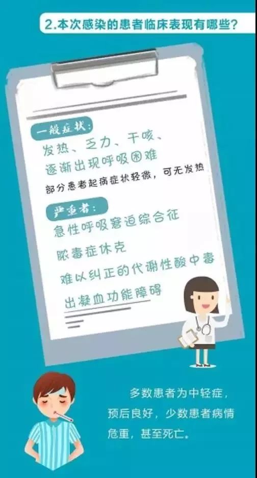 发热,乏力,呼吸道症状以干咳为主,并逐渐出现呼吸困难,严重者急性呼 吸窘迫综合征、脓毒症休克、难以纠正的代谢性酸中毒和出凝血功能障碍。部分患者起病症状轻微,可无发热。多数患者预后良好,少数患者病情危重,甚至死亡。