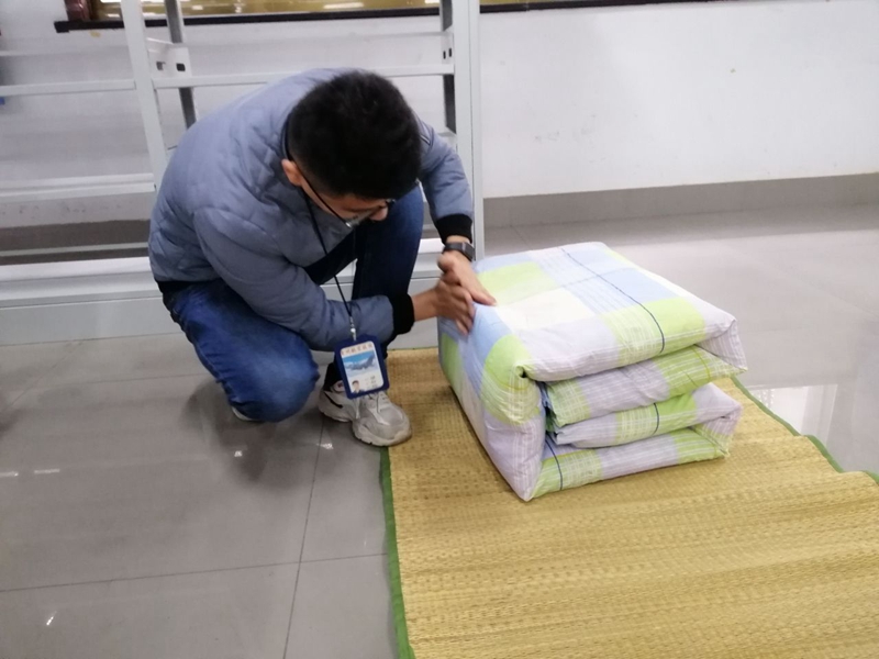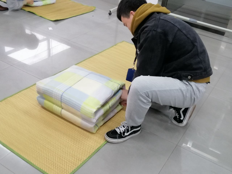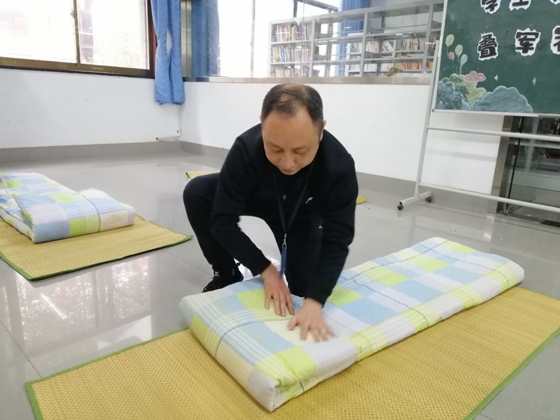 平时认真严谨的班主任在叠军被时也是格外仔细,“平铺、横拆、画线、竖着、修边、扯角”等各个动作做的有条不紊,得心应手。比赛在一种紧张又激烈的氛围中进行着。三分钟之内,原本散乱的被子犹如一个个“豆腐块”整齐端正。