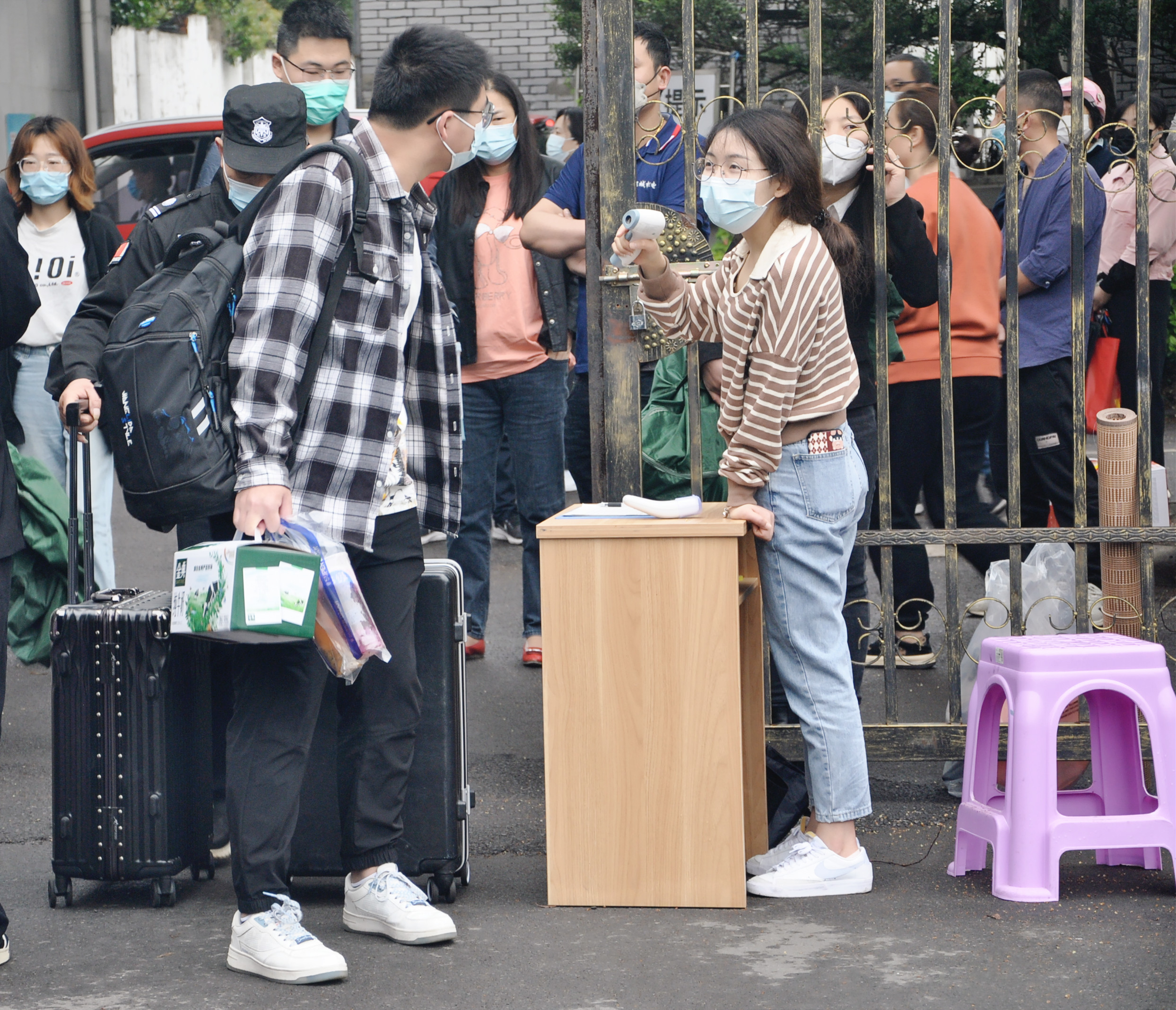 学生在校门口测温、扫场所码、出示健康码、行程码、核酸检测结果阴性证明方可入校,并及时将纸质材料上交至班主任处,学生家长一律不得进校。于复学当日,我校组织所有综合高中返校师生进行全员核酸检测。