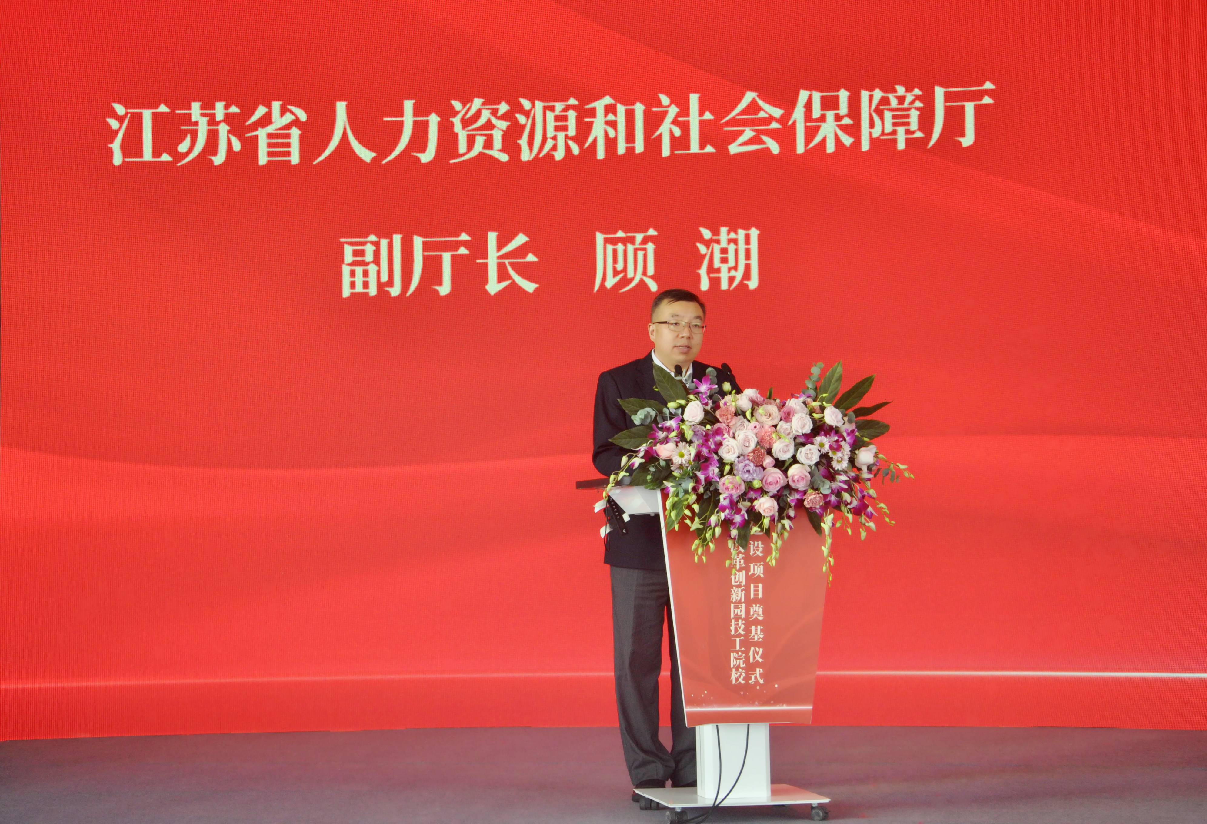 江苏省人力资源与社会保障厅副厅长顾潮发表讲话。他表示省人社厅将一如既往地支持常州技工教育发展,持续优化技工教育环境氛围。不断加大赋能力度,推动技工院校成为开展学制教育和职业培训、服务技能人才成长的重要平台,现代职业教育体系的重要组成,构建技能型社会的重要依托。加快培养更多的能工巧匠、大国工匠,为强富美高新江苏建设做出更大的贡献,并祝新校区的建设圆满顺利,祝常州人才技能工作再上新台阶。