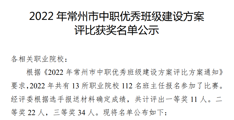 2022年在常州市中职优秀班级建设方案评比中荣获二等奖