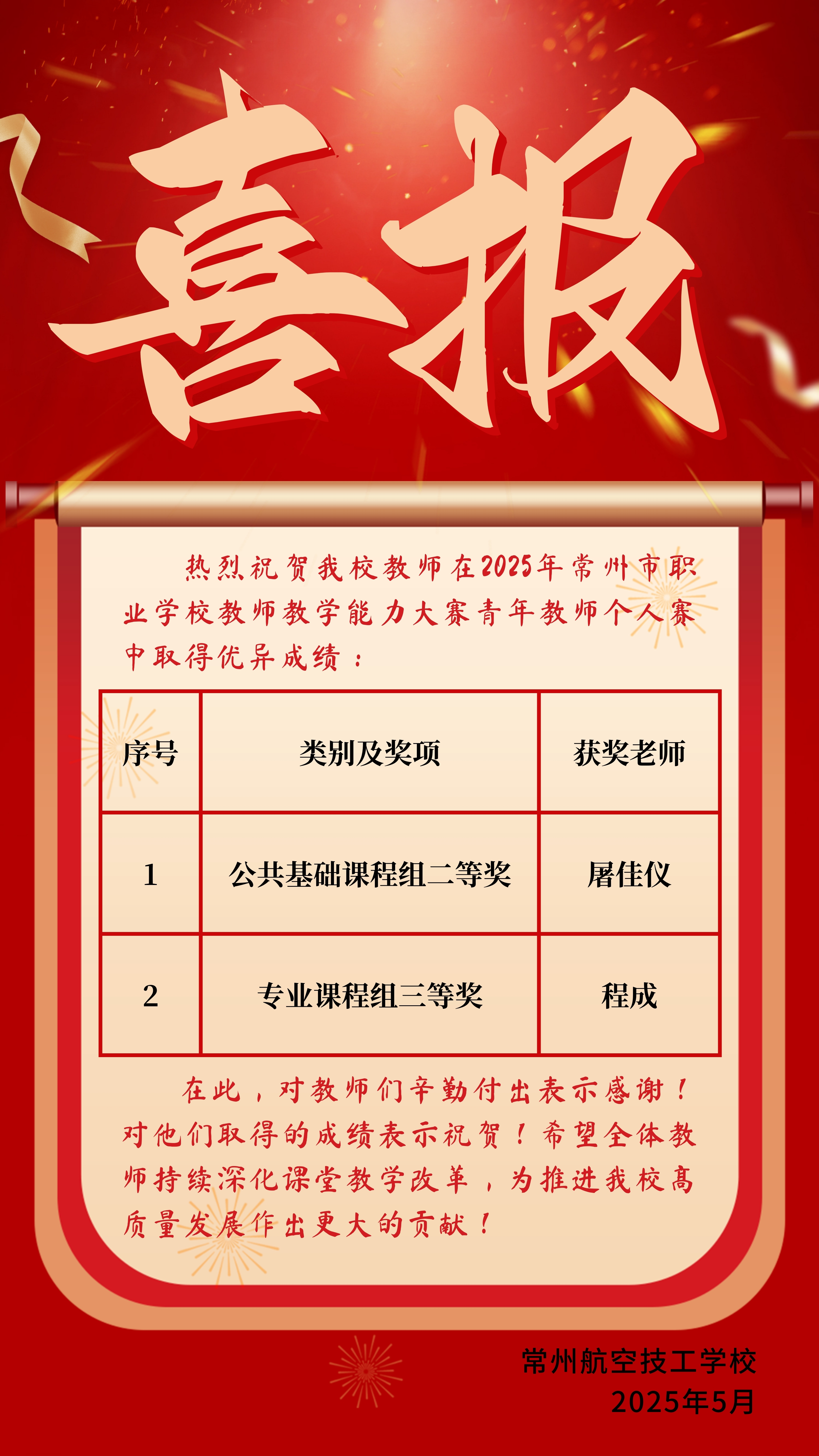 昂首见前路,低头自耕耘,星霜织锦绣,岁月赠甘醇。功夫不负有心人,经过一个多月的努力,我校屠佳仪老师在常州市职业学校教师教学能力大赛中荣获公共基础课程组二等奖,程成老师获得专业课程组三等奖。